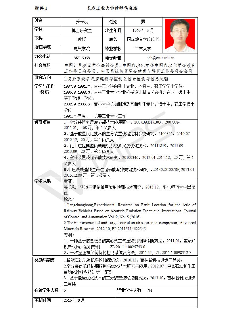 姜长泓教授,博士,现为太阳集团tyc151cc学科带头人,国际教育公司经理;长期工作在教学、科研一线,1996年任讲师,2001年任副教授,2004年破格晋升教授;吉林省第八届青年科技奖获得者、国家科技支撑计划课题负责人、吉林省第四批拔尖创新人才(第三层次)、长春市第五批有突出贡献专家、长春市第二届“百名优秀科技工作者”。目前担任中国自动化学会中国自动化学会教育工作委员会委员、中国系统仿真学会教育与科普工作委员会委员、中国计量测试学会高级会员。