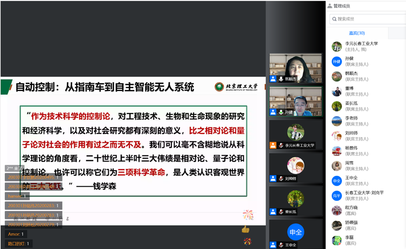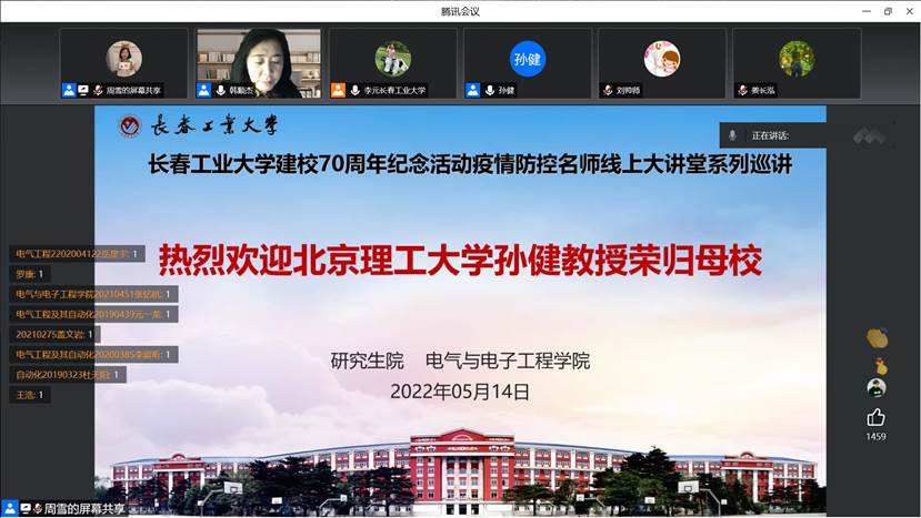 (通讯员 王申全)适逢70周年校庆之际,为鼓励科技交流和创新,提升学科和科学研究水平,5月14日19:00点,本校杰出员工—北京理工大学孙健教授应邀作了题为《从指南车到自主智能无人系统》的线上学术报告。此项活动由研究院主办,太阳集团tyc151cc承办。报告由公司经理韩顺杰主持,全校近800名师生在线听取报告。