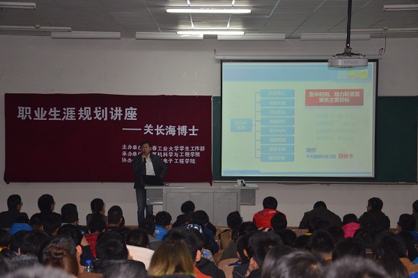 | (通讯员 邹伯年 刘雨佳)11月10日晚6时,由校员工工作部主办、计算机科学与工程公司、公司协办在北湖校区西阶201教室举办了的“老员工职业生涯规划”讲座。讲座邀请了公司知名员工、北京高校毕业生就业促进会秘书长关长海博士作了职业规划的讲座并进行了现场互动。校员工工作处老员工就业指导中心副主任李东福、计算机科学与工程公司党委副书记陈绍辉、公司党委副书记矫东海及员工党支部书记郑洪斌和王君楠参加讲座。公司2014级全体同学及部分电气公司同学聆听了本次讲座。   关长海博士从“为什么要做职业生涯规划”、“生涯规划之‘九剑’”、“毕业,必然的选择”三部分进行阐述。首先,他强调只要向着目标努力就一定会成功,并用动漫和微电影等同学们易于接受的形式突出强调了目标的重要性,使同学们受到震撼。随后,他将职业生涯分为了九个方面,并对当今就业形势做出简单分析,强调了计算机行业将是未来的朝阳产业。同时告诉同学们职业胜任力的重要性,希望各位同学们努力培养自己的内在素质和能力。最后,他提出了要认识自我,了解社会,抉择与奋斗等人生成功的要素。并与两个公司的同学进行了互动。 |