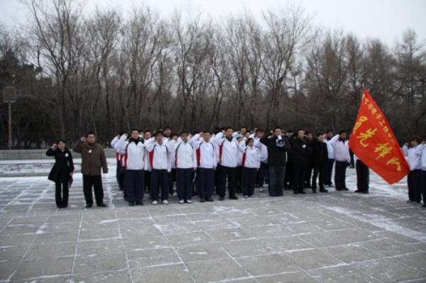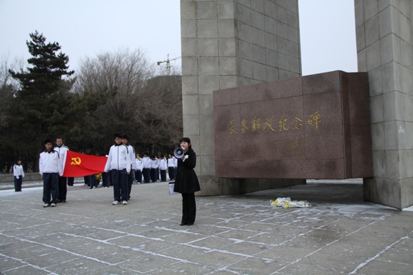 院团委副书记张哲同学宣读本次活动的目的及意义,天气虽然寒冷,但一声声的讲词使得同学们不畏严寒,表达了同学们对先烈的敬重之情。党员代表向烈士纪念碑献花,两束雪白的鲜花是同学们的敬意的表达,是激励同学们前进的动力。在赵爽老师带领下党员同学们举起右手在烈士墓前面对党旗庄严宣誓,铿锵的誓言激励同学们时刻以党员的身份严格要求自己,做模范带头作用,学习先烈的英勇无畏。最后由员工代表院员工会主席董丰嘉同学发言,我们要牢记自己的使命,不忘先烈遗志,继承先烈们的光荣传统,从一点一滴做起,中华民族伟大复兴的开拓者,弘扬“奉献、友爱、团结、进步”的时代主旋律,勤奋学习。员工党支部书记郑洪斌老师在总结发言时希望大家珍惜今天,把握明天,创造未来。