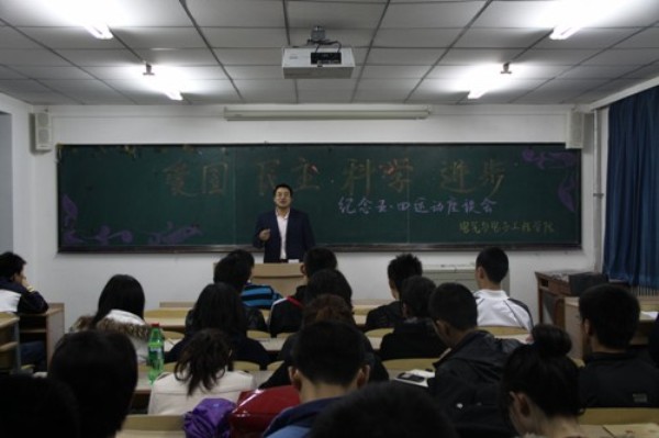 爱国,民主,科学,进步 ——我院举行纪念五四运动九十一周年座谈会 2010年5月5日晚6:30,我院在主楼1403教室举办了“爱国,民主,科学,进步”为主题的纪念五四运动九十一周年座谈会,公司员工党支部全体党员同学参加座谈会,员工党支部书记赵爽老师主持本次座谈会。