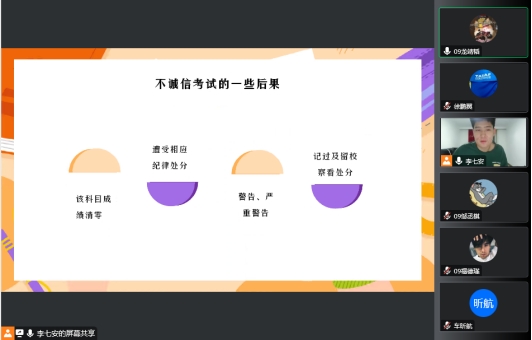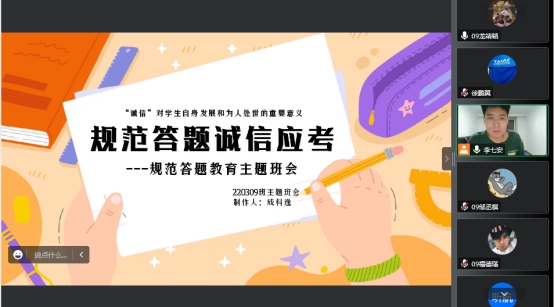 会议强调诚信考试的重要性,并指出诚信考试的目的以及要求。同时结合小故事以及案例提高同学们的诚信意识,让同学们明白,无论是任何形式的考试,诚信考试都不是束缚,而是作为新时代新青年应该承担的责任。