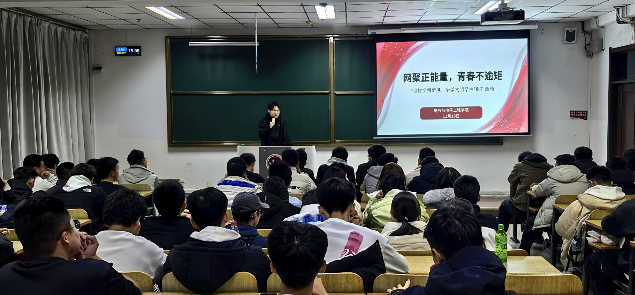 活动现场,学长通过案例分享、互动讨论等形式,向同学们阐释网络正能量的重要意义。