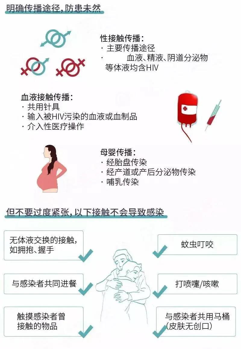 1.血液传播。主要包括输血及外伤,若输入了含有HIV的血液或血制品、与HIV患者共用同一注射器进行吸毒等就会有感染艾滋病的危险。日常生活中,在皮肤粘膜没有破损的情况下,如果接触到艾滋病毒感染者的血液是不具有传染性的。与HIV感染者拥抱、进餐、乘车、共用学习用品、共用卫生间、打喷嚏或咳嗽、蚊虫叮咬等均不会感染HIV。