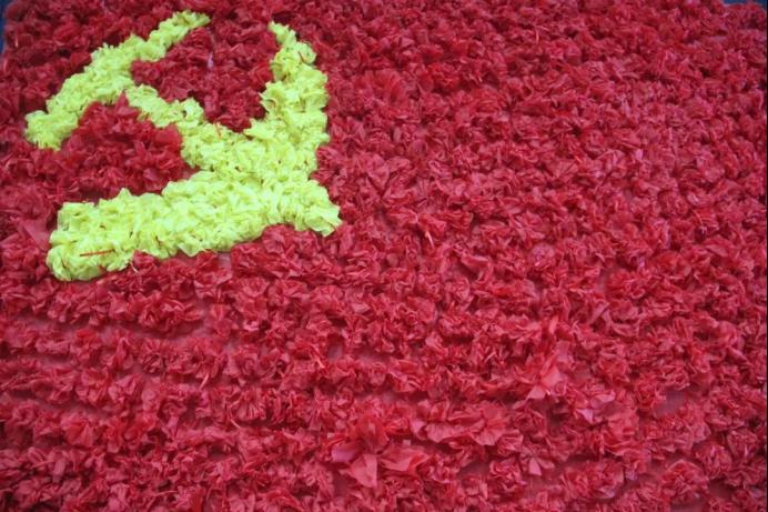 您再瞧瞧这个,这个呀,是我们用彩色宣纸剪出来这份的党旗,一段时间以来我们就想送您这份礼物,同学们也饱含着深情开始了筹备,倾注了大家的心血,而这份党旗已经牢牢的扎根在了我们的心中,将会在时代的风浪下坚毅不倒,是我们未来前进道路上的明灯!