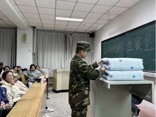 劳以养德,勤以修身。出门看队伍,进门看内务,训练场上磨炼精神。内务整理彰显态度,在学长们的示范下,同学们有序进行了内务整理的学习。叠、压、折、挤、捋、修,几个动作下来被子变成了有棱有角的“豆腐块”。