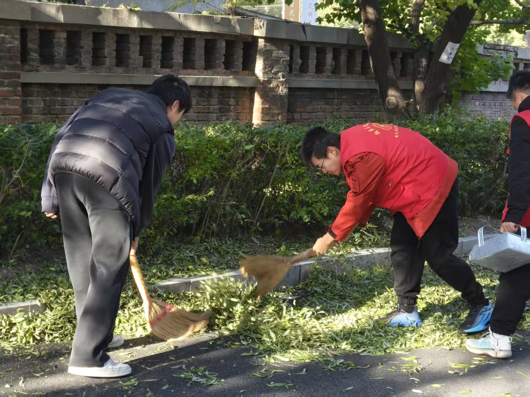 面对散落的落叶,大家相互配合,干劲十足,忙碌的身影成为校园里一道别样的风景线。