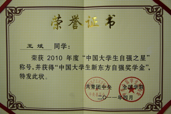 公司王斌同学荣获2010年中国老员工自强之星