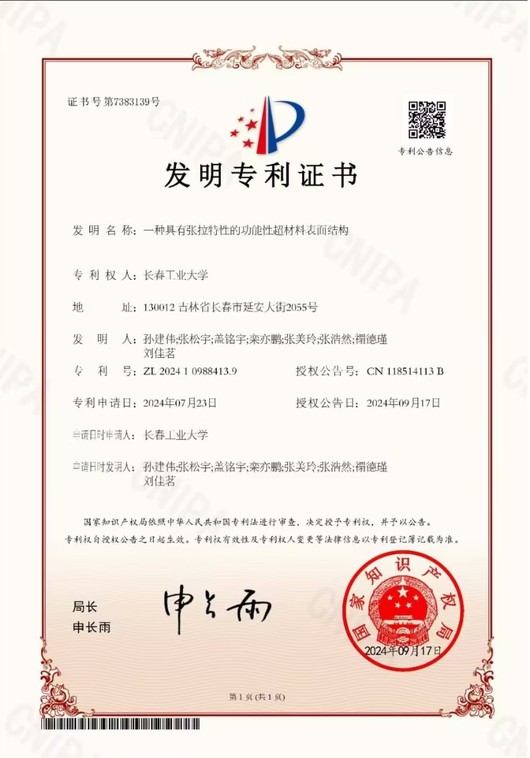 公司员工张建伟张松宇盖铭宇,栾亦鹏,张美玲,张浩然,禤德瑾成功申请专利