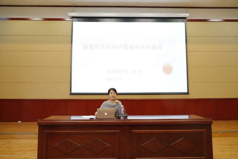 东北师范大学教育学部教育管理公司教授、博士生导师夏雪作了题为“加强研究生科学道德和学风建设”的专题报告。从研究生科学道德和学风建设“是什么”、“为什么”以及“如何加强”三个方面,指出当代研究生加强科学道德及学风建设的重要性,并引用了国内外学术不端的例子告知同学们如何正确遵守学术界的标准,切勿抄袭剽窃他人文章、一稿多投、伪造或篡改实验数据等,希望同学们高度重视科学道德与学风建设,在科研道路上不断加强自身学术道德修养,牢记新时代高层次人才身上的重任,要坚守学术诚信,维护学术尊严,摒弃学术不端,以优良的学风全身心投入到学习和科研事业中。