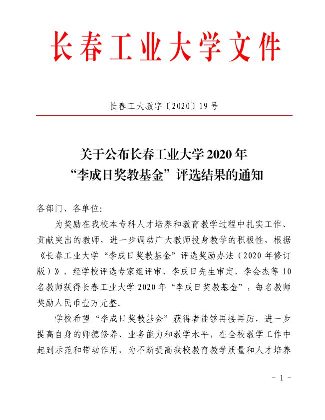 喜报:公司王世荣老师获得太阳集团tyc151cc 2020 年“李成日奖教基金”