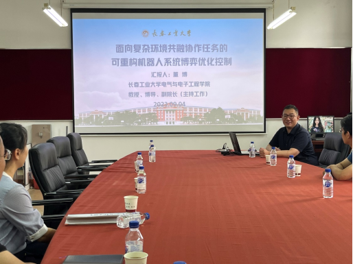 在交流会上,董博做了题为“面向复杂环境共融协作任务的可重构机器人系统博弈优化控制”的报告,介绍了课题组近期的研究工作进展,针对可重构机器人的实际应用背景与结合任务需求,考虑可重构机器人的不同构型、工作环境、面向对象等多个角度,提出相应的控制方法以实现最优控制。潘强作题为“面向复杂任务约束的多臂可重构机器人自学习优化协调控制方法研究”的报告,对课题组现阶段的国家自然科学基金面上项目的中期研究进展进行了详细汇报,总结了目前的研究成果。王悦西做了题为“面向人机共融的可重构机器人分散交互控制方法研究”的报告,对其目前所研究的工作内容进行了汇报,针对人机交互任务下的可重构机器人控制方法以及主被动模式切换进行了详细阐述。