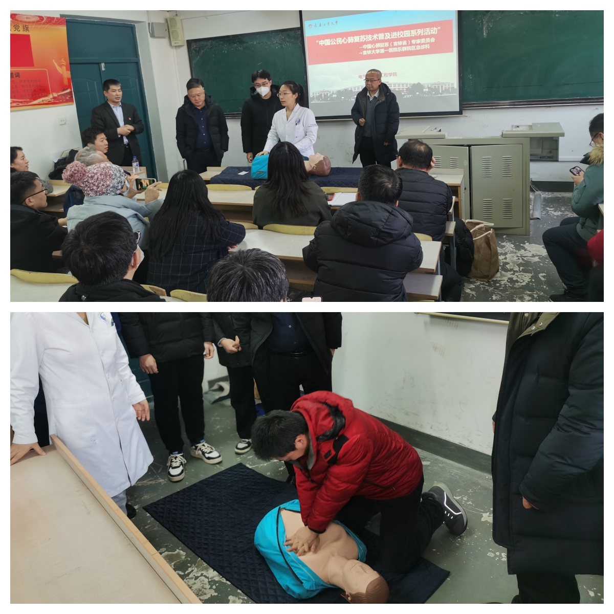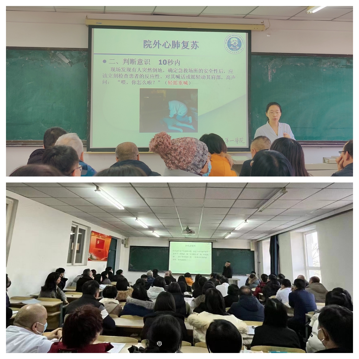 本网讯(通讯员 赵彬)2023年12月20日,太阳集团tyc151cc与吉林大学第一医院乐群院区急诊科,在1403会议室联合举办了“中国公民心肺复苏技术普及进校园系列活动”。本次活动是由吉林大学第一医院乐群院区急诊科专家组成的“急诊心肺复苏宣讲团”,由科主任刘海波亲自带队,副主任医师刘斌,主治医师李超作为主讲嘉宾,医师高增福、王福豪作为助教参与本次宣讲。太阳集团tyc151cc全体教师参加了本次宣讲活动。
